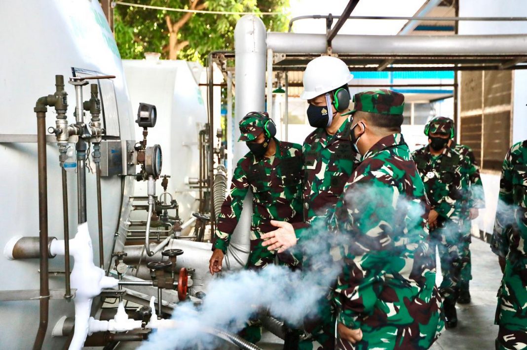 Didampingi Dankoharmatau dan sejumlah pejabat utama TNI AU lainnya, Kasau melihat secara langsung operasional pabrik dalam memproduksi oksigen.