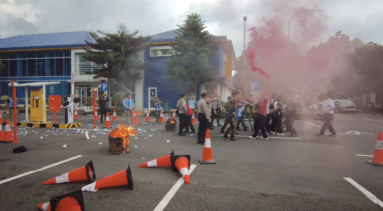 Dalam skenario simulasi, diperagakan langkah-langkah personel dalam pengamanan aksi unjuk rasa yang mengarah ke GT. pasteur, dimulai dari situasi hijau, meningkat ke kuning, hingga merah.